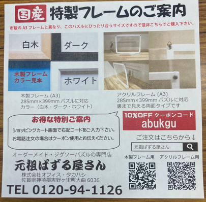 実は組み立てた後に、ジグソーパズルを飾るための高級特製木製フレーム(日本製)は、元祖ぱずる屋さんのECサイトで販売しております。色は、「ナチュラル(白木)」「ホワイト」「ダーク」から選択できます。