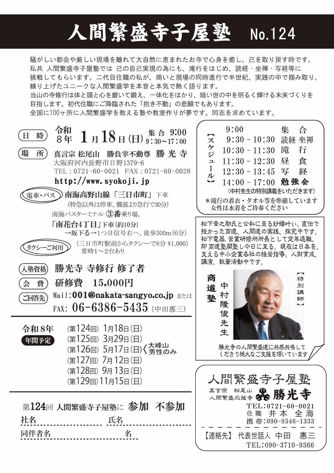 滝行で有名な、大阪の勝光寺で「人間繁盛寺小屋塾」が、令和8年1月18日(日曜日)に行われます。